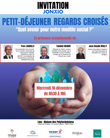 Le prochain petit-déjeuner “Regards Croisés” de la Fédération JONXIO se tiendra le mardi 10 décembre de 8h30 à 10h à la Maison des Polytechniciens, sur le thème : « Quel avenir pour notre modèle social ? ».